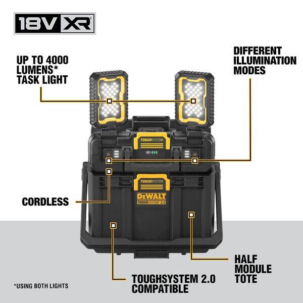 DEWALT TOUGHSYSTEM 2.0 oppladbar, justerbar arbeidslampe og oppbevaringskoffert, utstyrt med to 360° svingbare lys og sju lysstyrkemoduser. Passer til alle arbeidsoppgaver. Kraftig, effektiv LED-teknologi produserer opptil 4 000 lumen med naturlig hvitt lys. Den justerbare arbeidslampen kan brukes frittstående, kan stables på alle TOUGHSYSTEM 2.0-moduler, monteres på stativ eller henges opp med en integrert krok. DWST08061-1 er kompatibel med alle DEWALT 18V-batterier for opptil 3 timers brukstid på maks effekt. Med 54V batteri (maks 9 Ah) har den en brukstid på drøyt 5 timer. Den kompatible verktøykofferten med vippesikkert håndtak er utformet for oppbevaring av viktige verktøy for dedikerte arbeidsoppgaver. Med slagfast hus og lys, tåler den krevende arbeidsoppgaver.